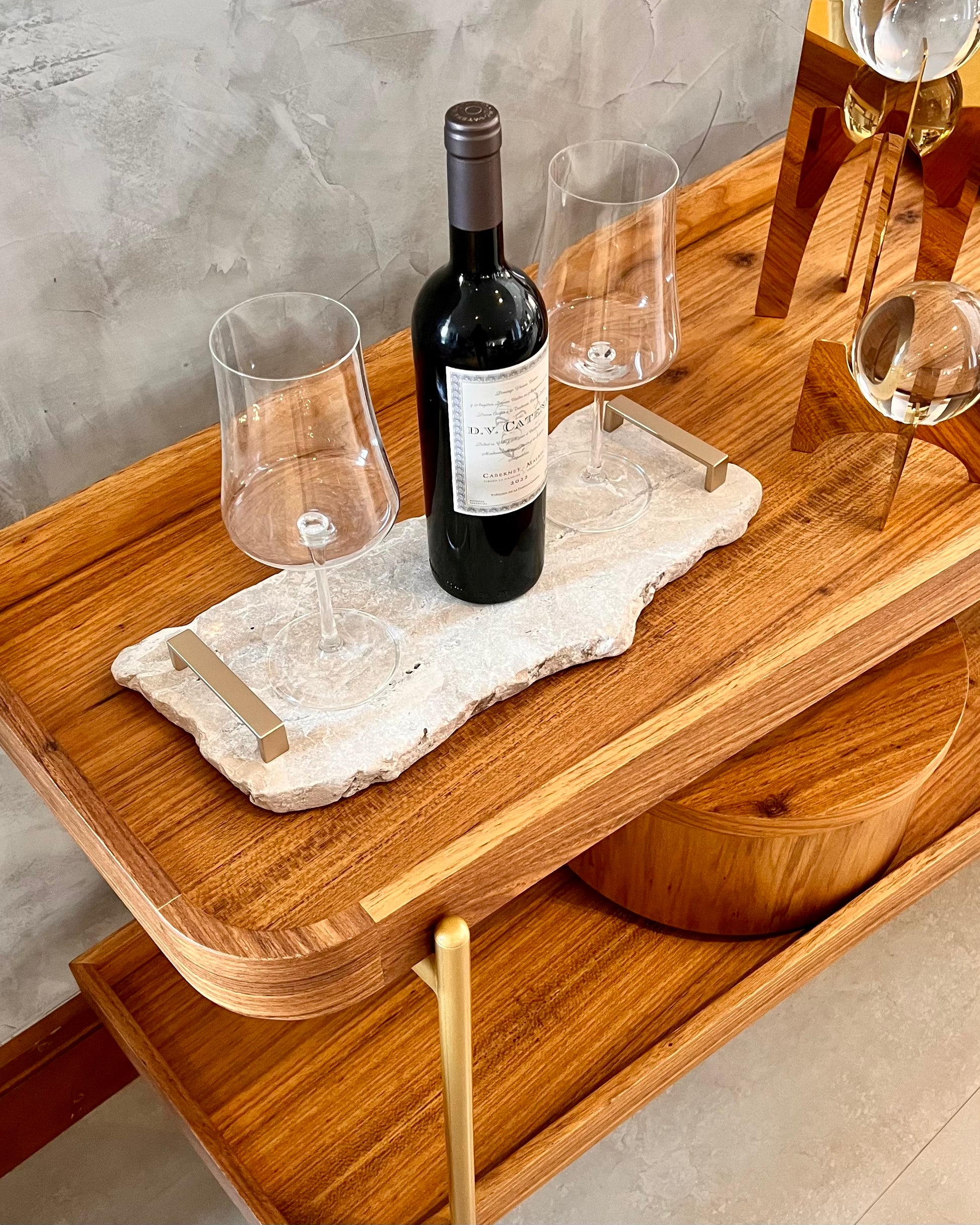 Bandeja Orgânica - Mármore Travertino White Cream - Com Alça Dourada 40x20 Cm