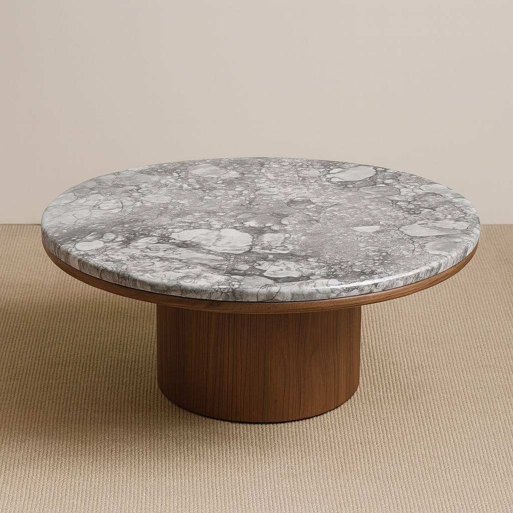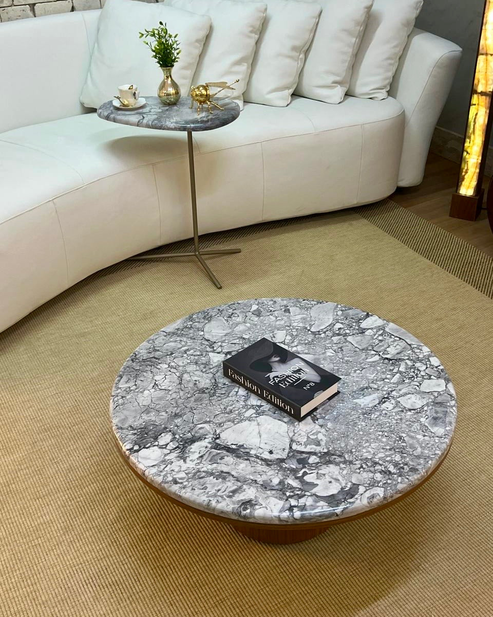 Mesa de Centro - Malbec Dallas - Mármore Rafaello Textura do Tampo Polido (Com Brilho) / Base Cilindro Grande com Borda