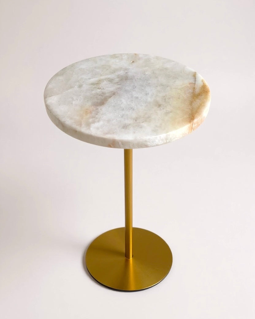 A coleção de mesas de apoio em Quartzito Cristallo Gold une sofisticação, funcionalidade e exclusividade em cada detalhe.