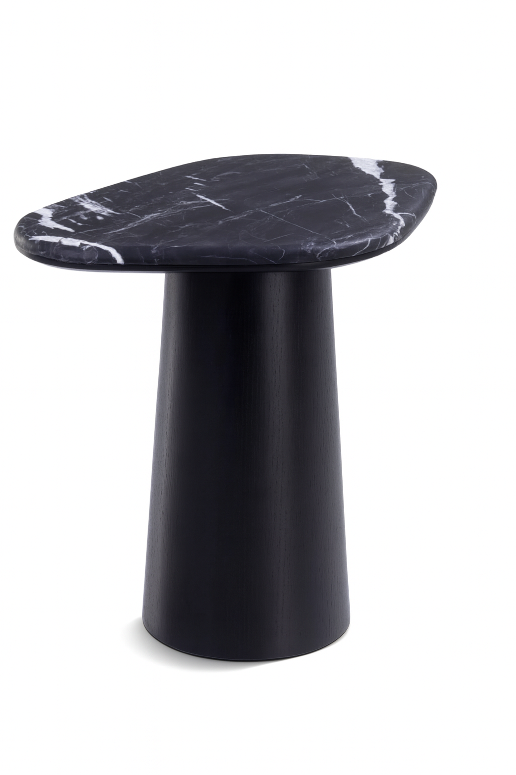 Mesa Conha de Apoio - Mármore Nero Striatto - Base Cilindro Robusta Madeira Ébano