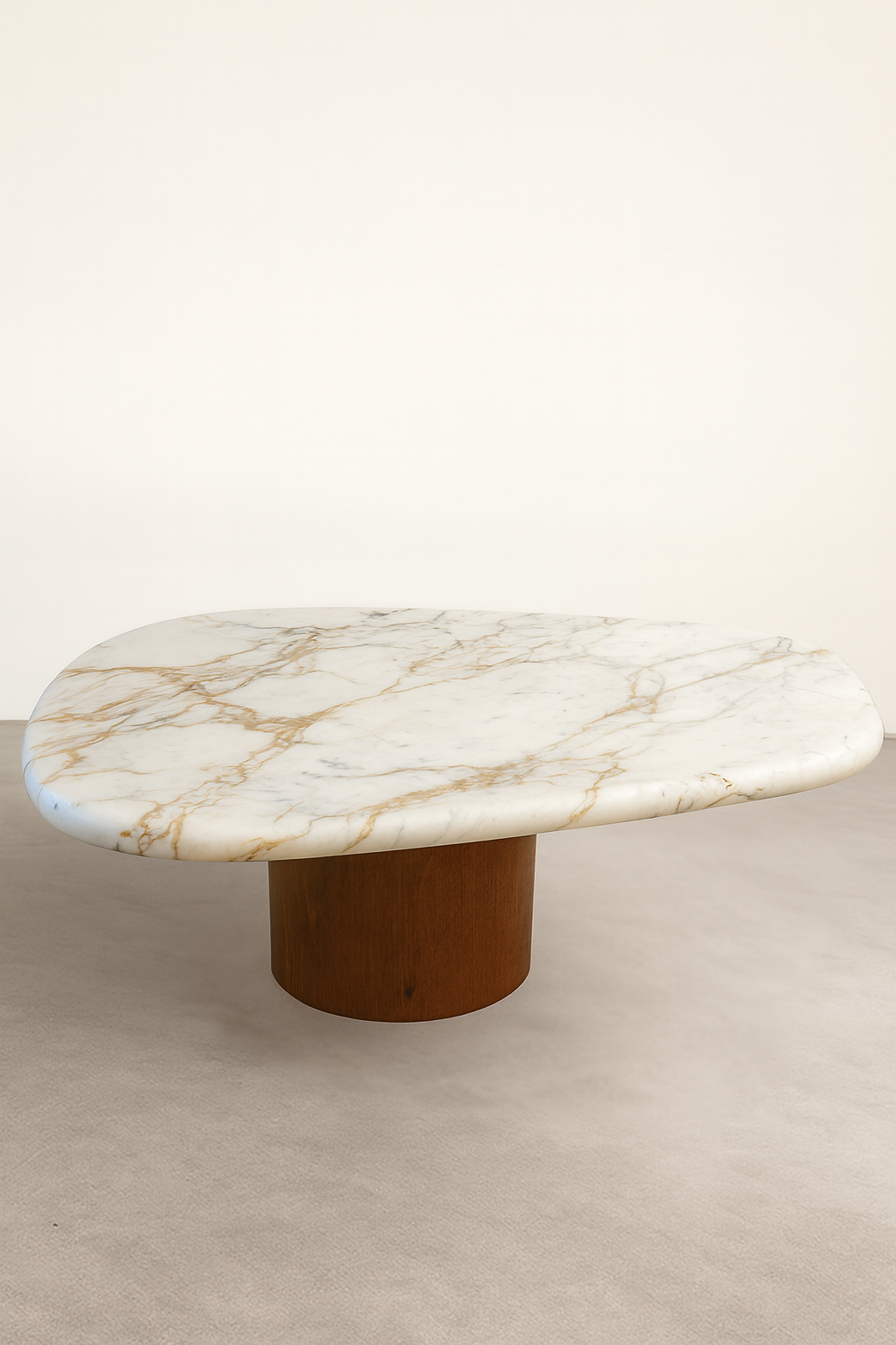 Mesa de Centro - Concha Quartzito Cristallo Textura do Tampo Polido ( Com Brilho ) - Base Cilindro Grande Madeira Nogueira