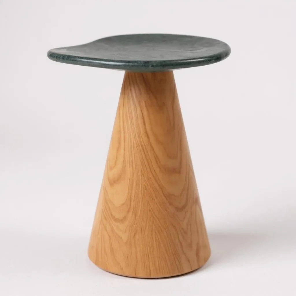 Mesa Eclipse Orgânica - Mármore Verde Guatemala - Base Cone Madeira Freijó