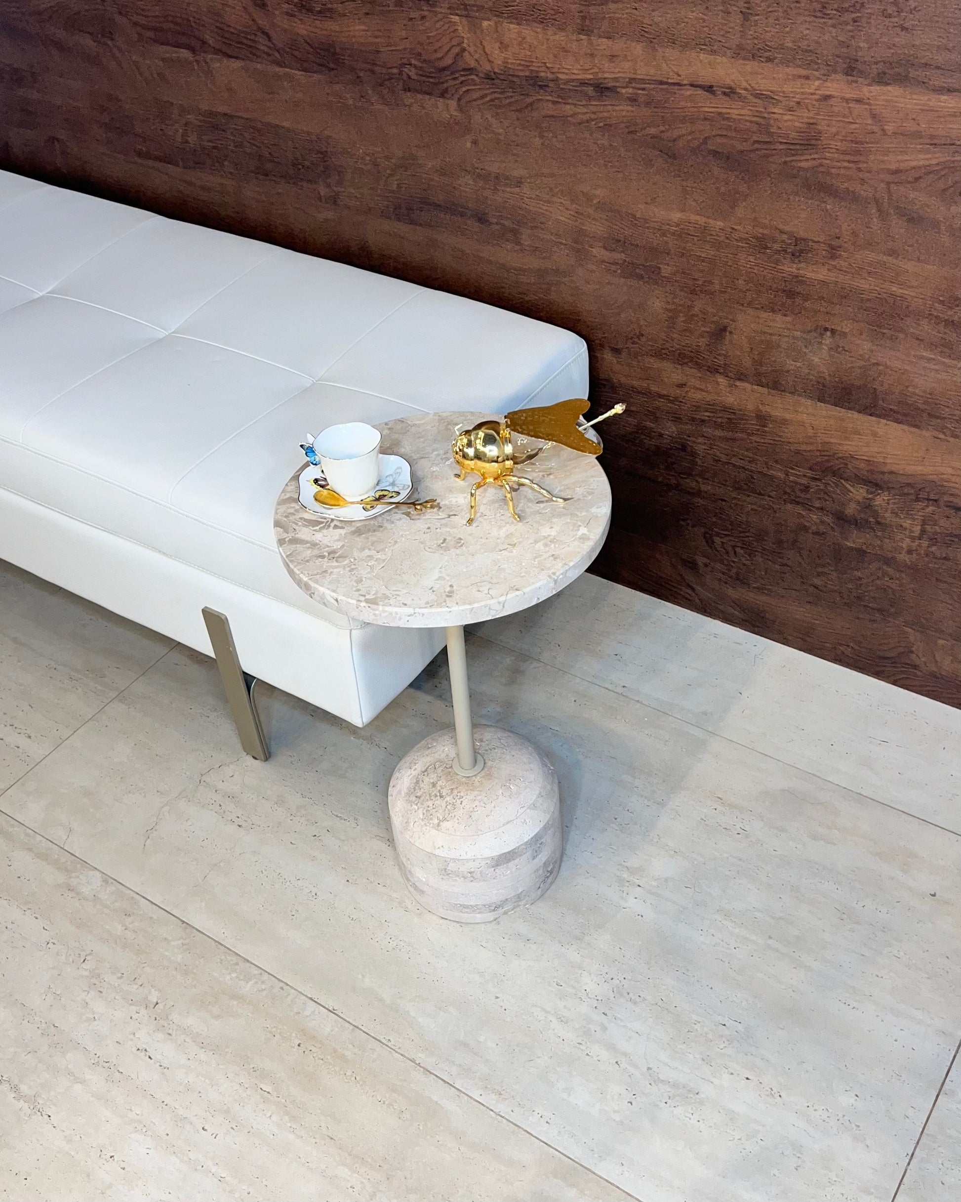 Mesa Lateral Bloco - Base Mármore Travertino Nacional - Base acabamento Redondo