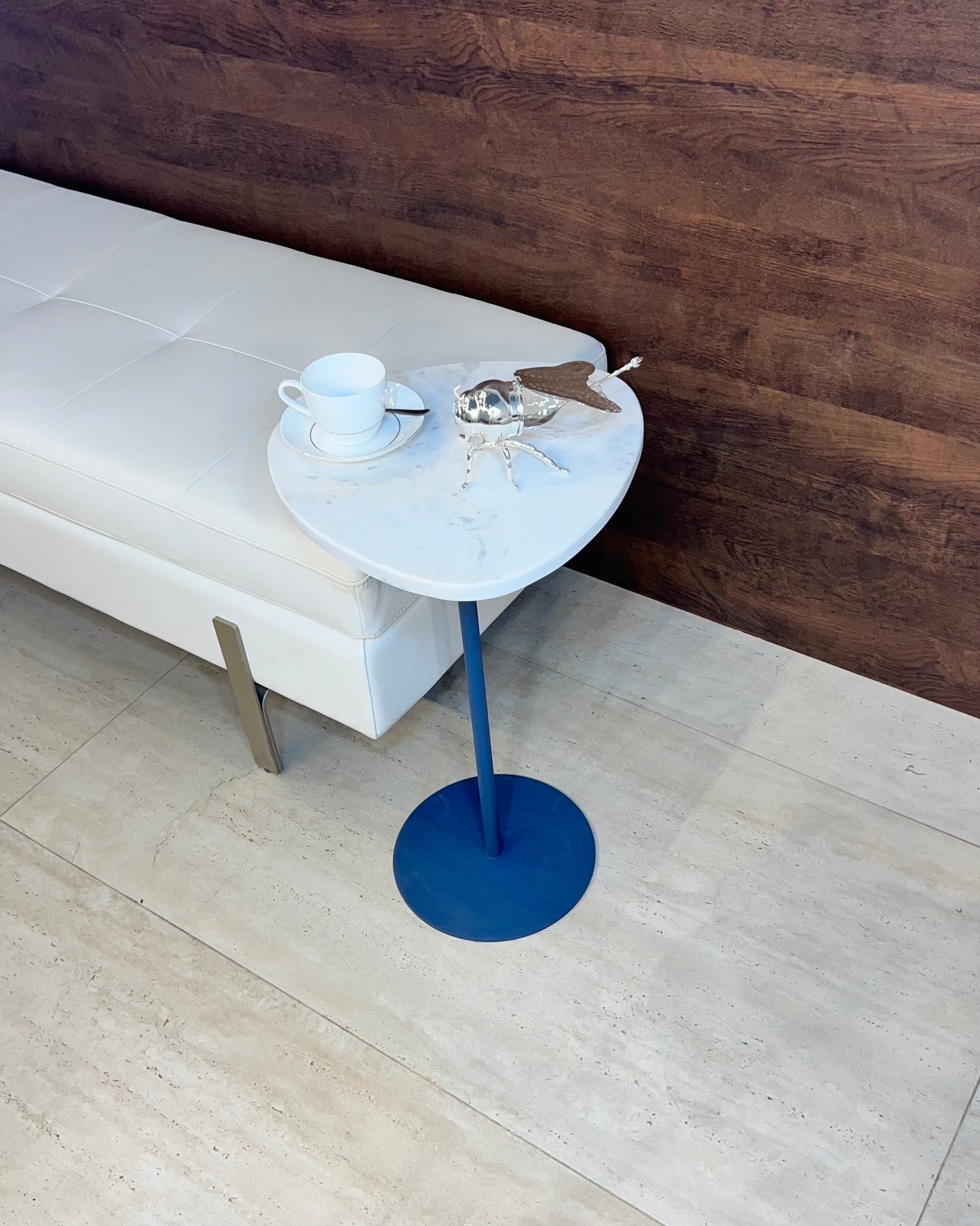 Mesa Lateral - Mármore Calacatta / Base cor Azul / 60 Cm de Altura - Peça Única