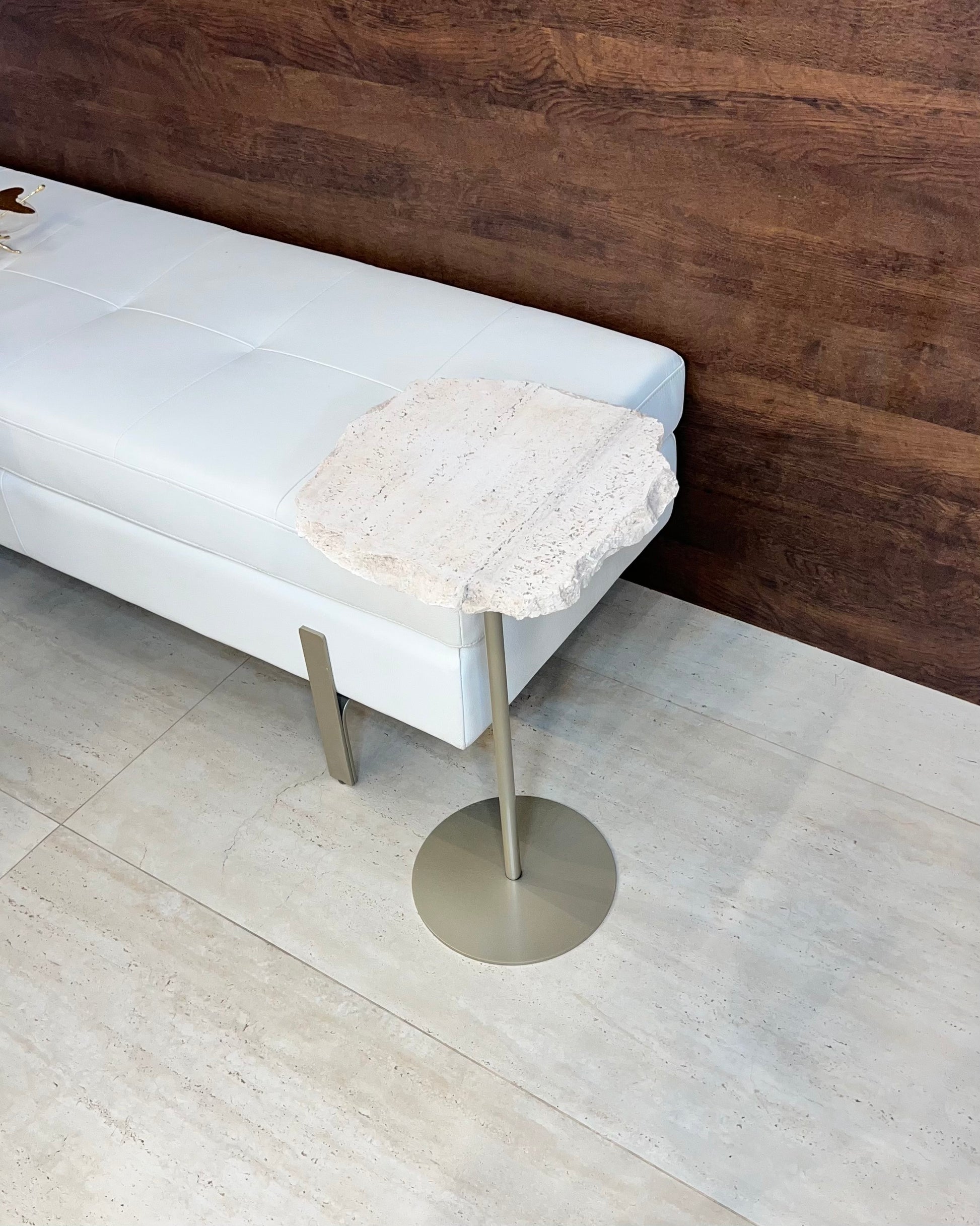Mesa de Apoio- Mármore Travertino Romano Orgânica - Base cor Champanhe