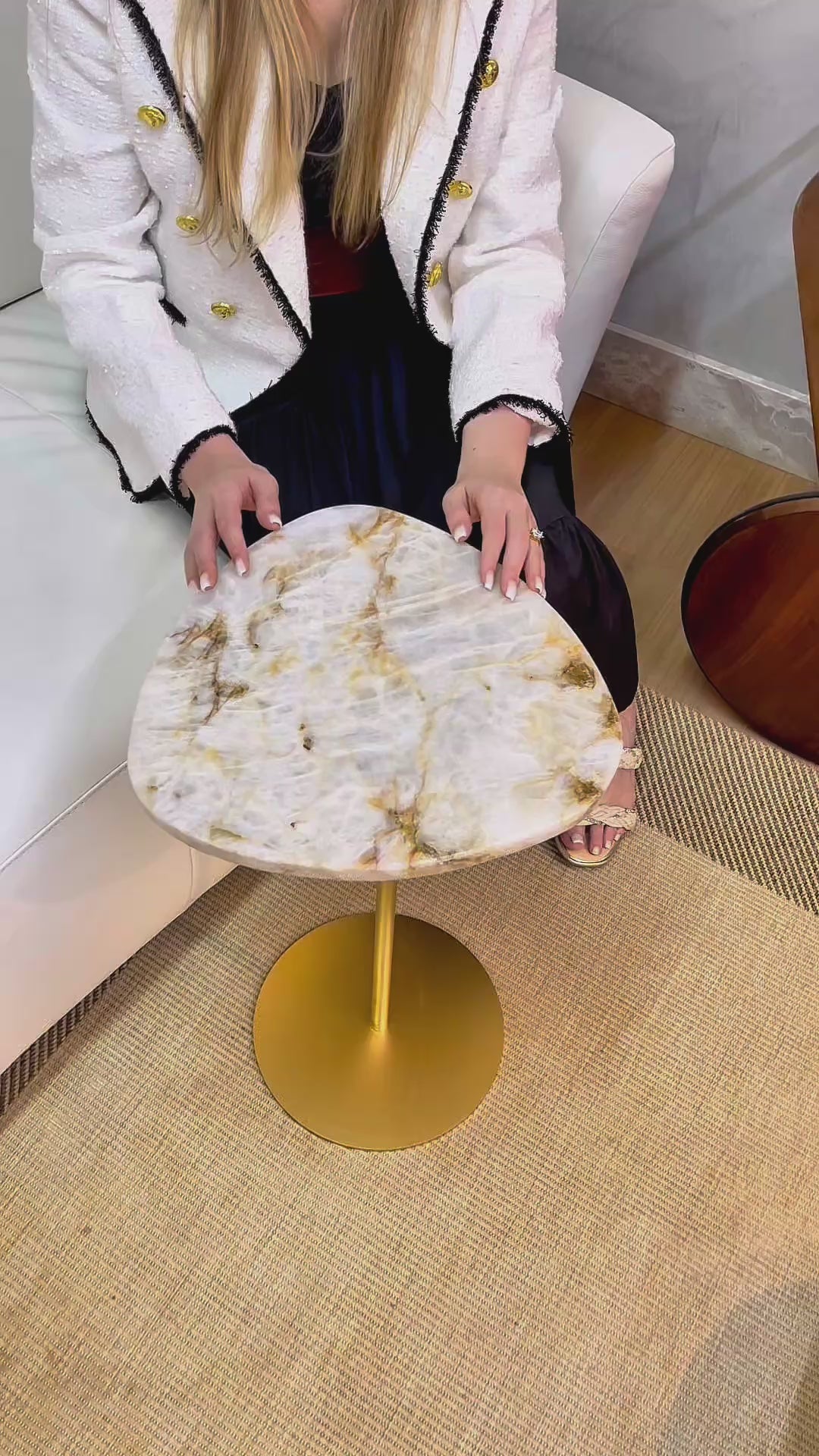 Com base dourada oro e proporções harmônicas, esta mesa é um convite à contemplação: perfeita para compor cantinhos de café, leitura ou momentos de pausa com presença e estilo.