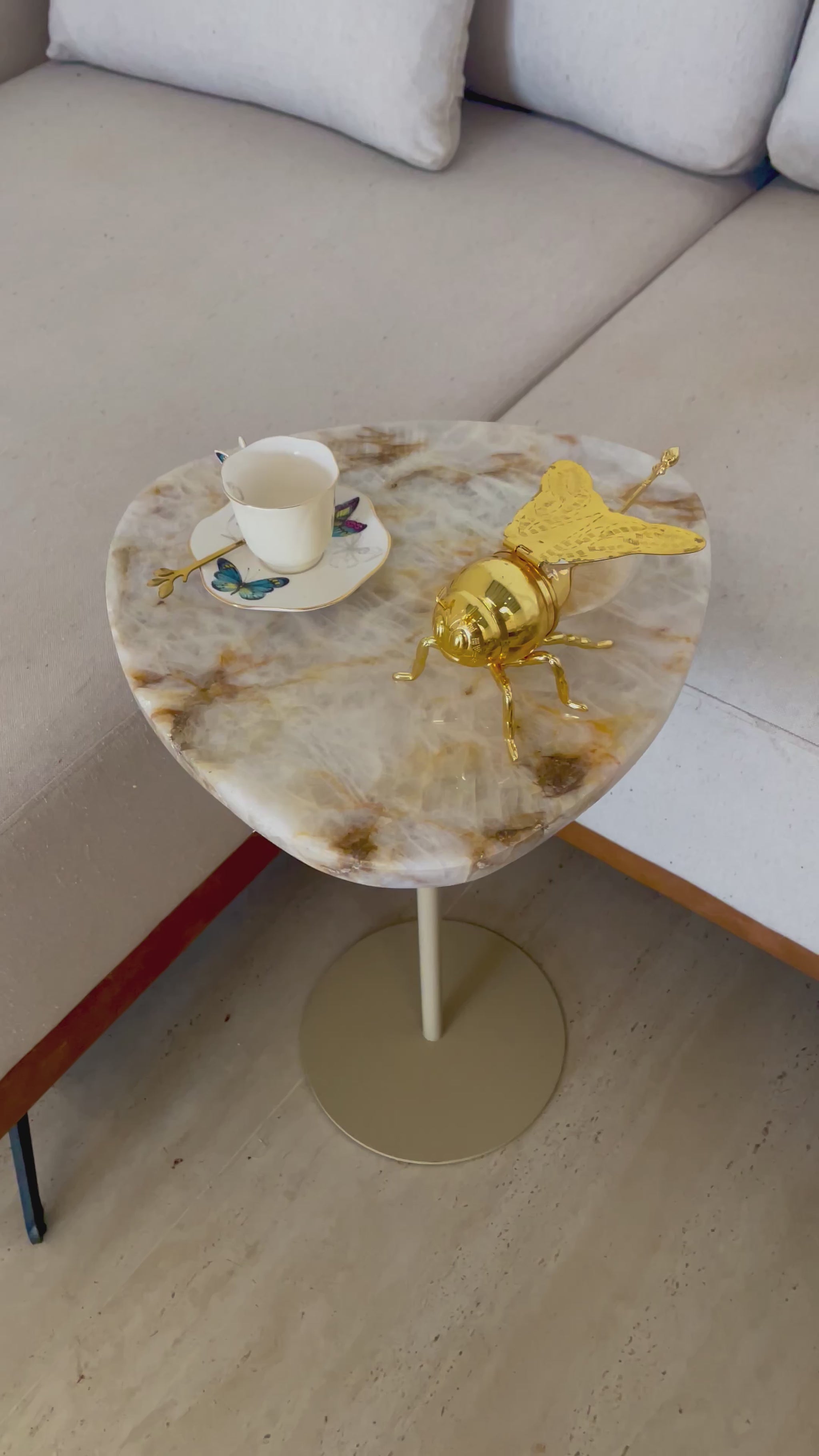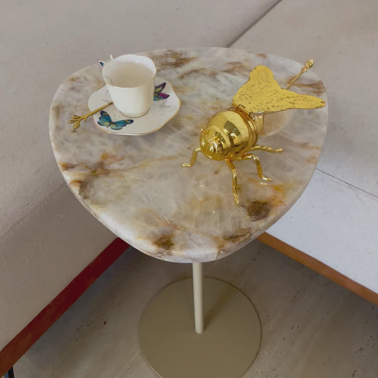 Mesa de Apoio - Linha Essencialle - Quartzito Cristallo Gold- Base cor Bege Redonda