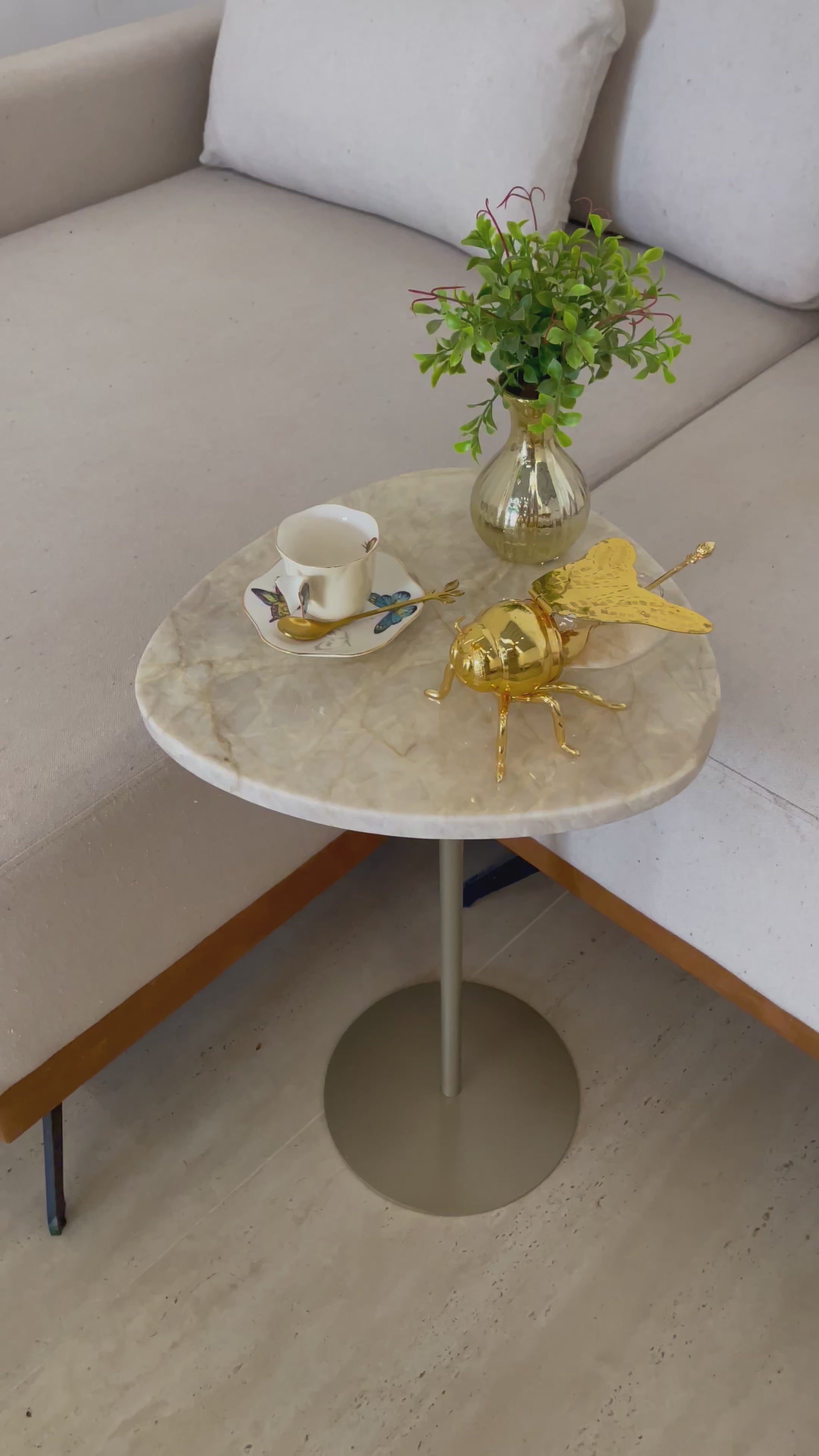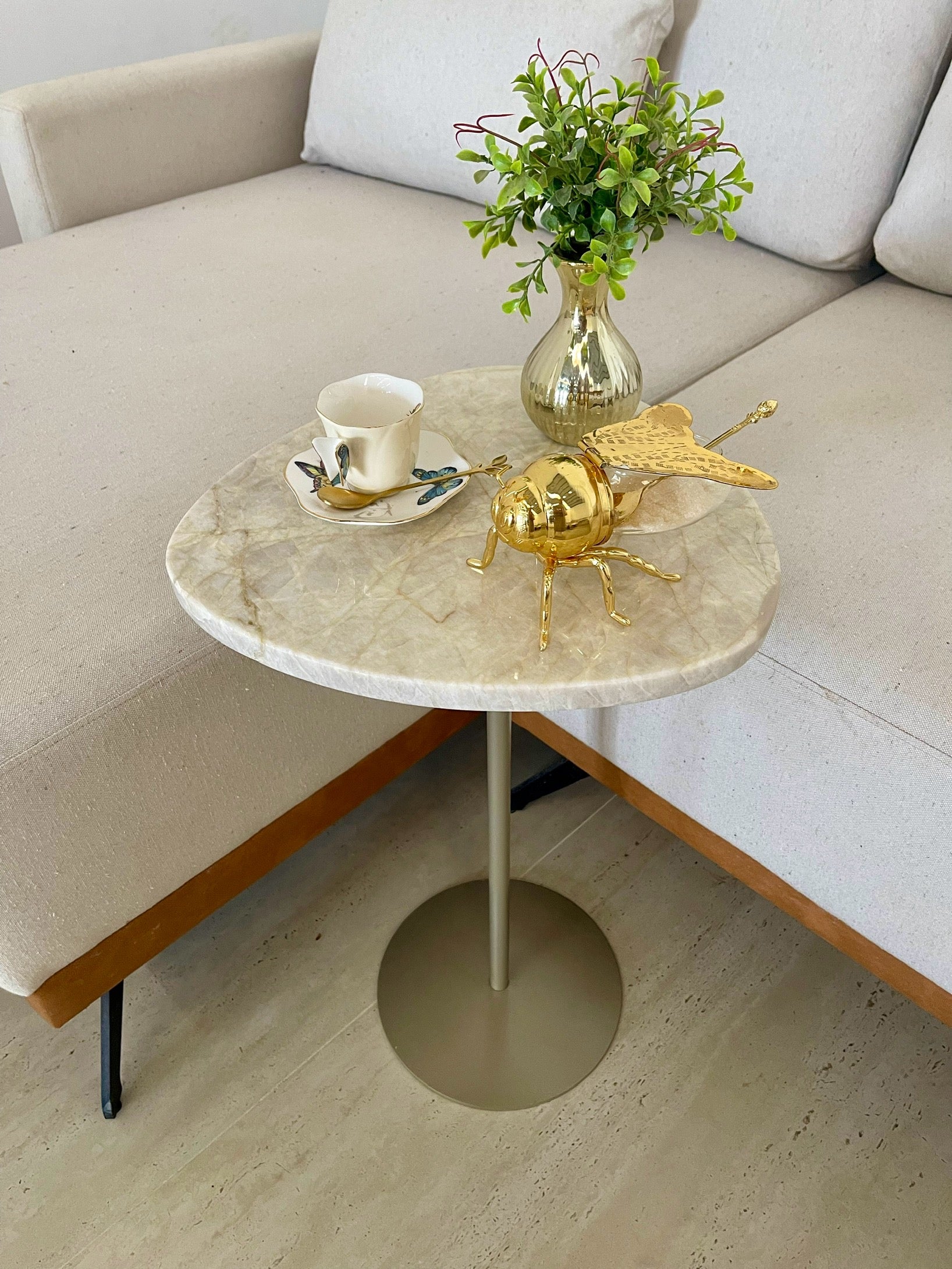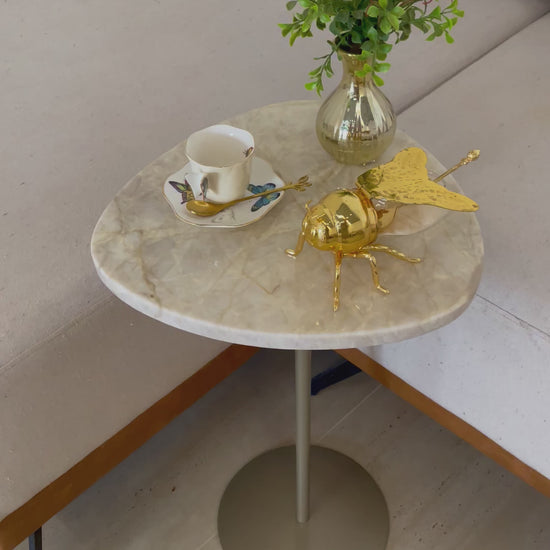 Mesa de Apoio - Linha Essencialle - Quartzito Perlla Santana - Base cor Champanhe Redonda