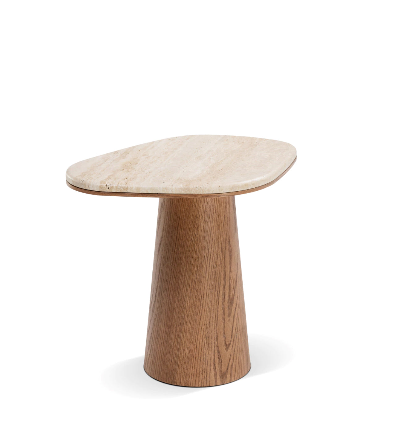 Mesa Conha de Apoio - Mármore Travertino Romano Legítimo - Base Cilindro Robusta Madeira Freijó